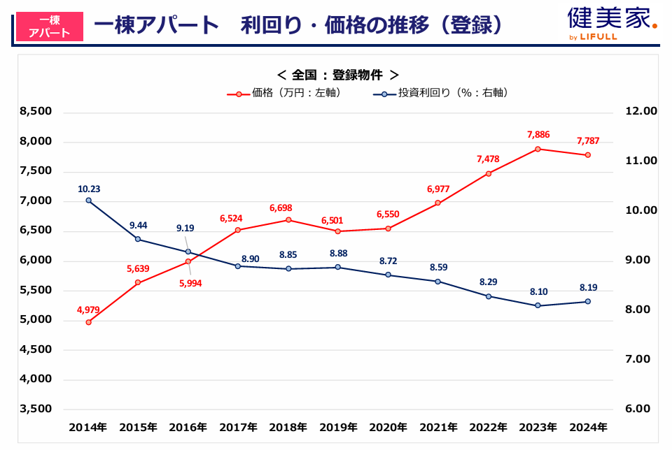 2024年時点での一棟アパートの価格相場は、築年数が経過するほど下落する傾向にあります。