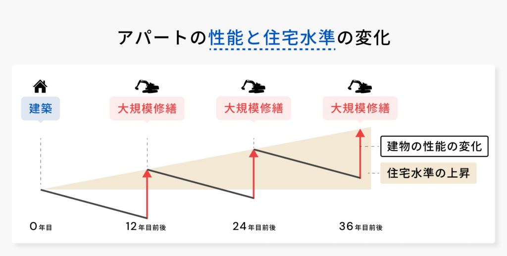 国土交通省によれば、定期的な補修を行いつつ、図のように12~15年周期で大規模修繕を行うことで建物の劣化を防ぎ、社会が要求する性能水準を維持することが重要です。ただし、これはあくまでも目安であり、当然木造や鉄骨、鉄筋コンクリート(RC)などの構造や、工法、劣化状況などによってもタイミングに差が出るため注意が必要です。5年など定期的に点検を行いつつ、自身がもつアパートの最適なタイミングを見つけましょう。