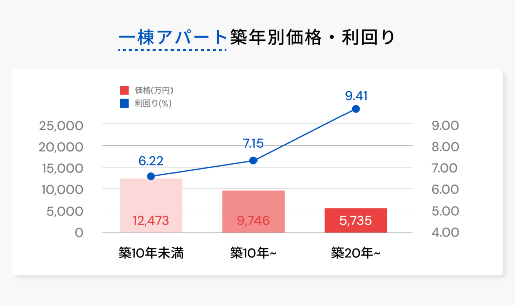 上記はすべてのアパートの平均であり、当然築年数によっても利回りは大きく異なります。2025年の築年数ごとのアパートの平均利回りは次のとおりです。