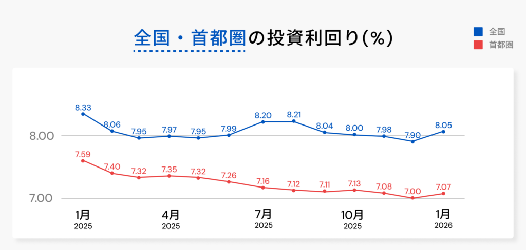 参照:健美家「収益不動産 市場動向 マンスリーレポート 2026年 1月期」(データを元にグラフを作成)