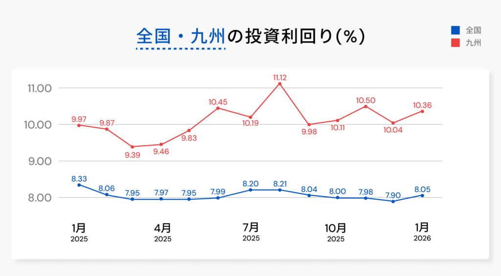 九州・沖縄の利回りは全国平均よりも高い10.36%(2026年1月)で、やや上昇傾向が見られます。特徴的なのが福岡市で、人口が増加し家賃相場も上昇しています。福岡市のアパート購入価格は約7,500万円と、九州・沖縄の平均値5,808万円よりも高く、利回りは地域平均よりは低めになる傾向があります。